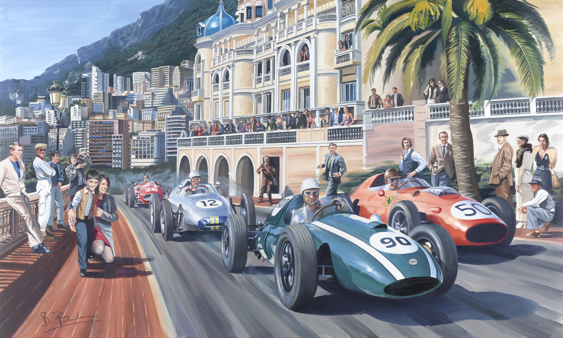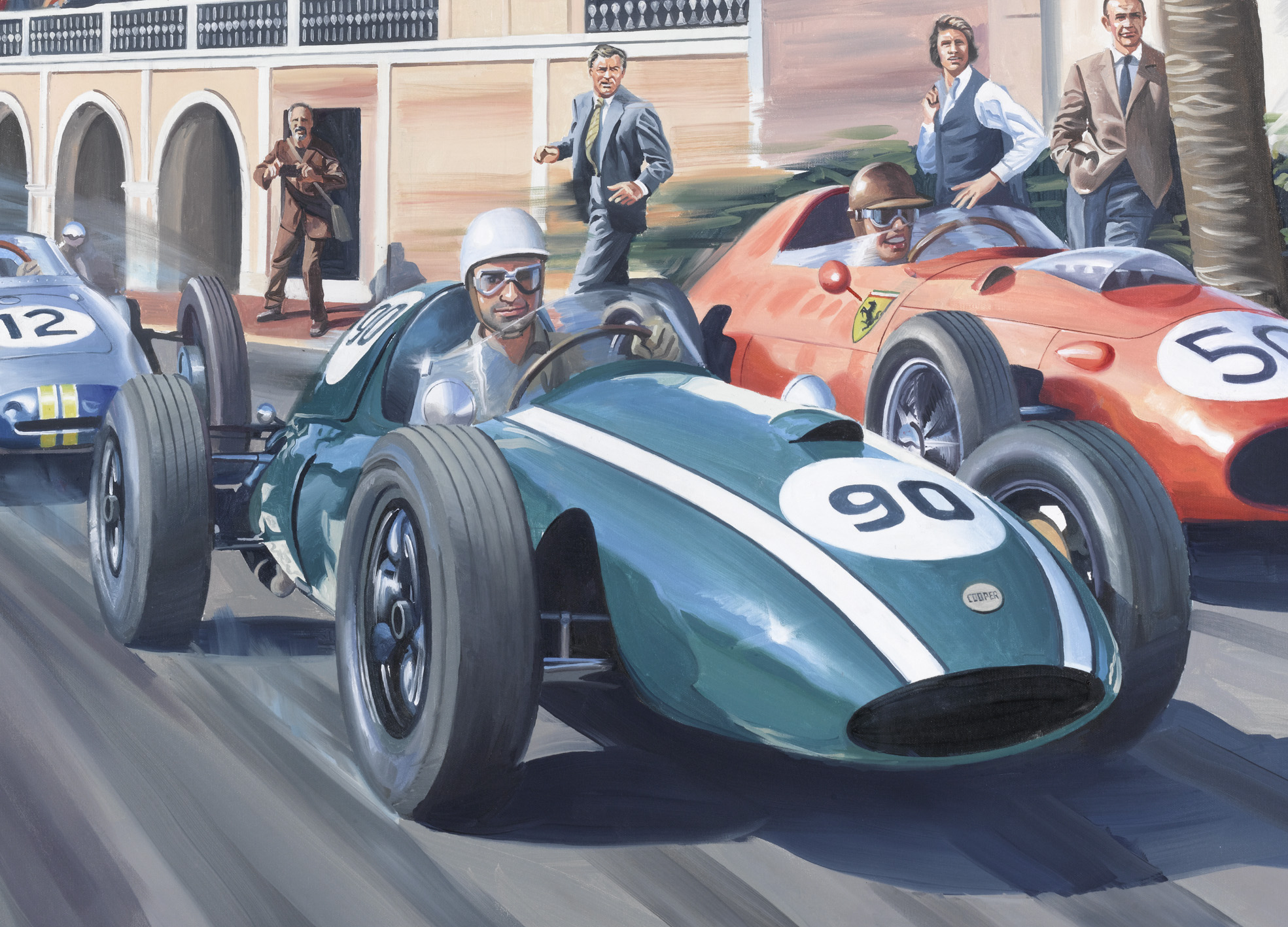 Cette peinnture mélange la réalité historique et les nécessaires contraintes d'une commande.Les voitures sont conformes à celle qui ont participé à la course de 1959 (Cooper T51, Ferrari Dino 246, Porsche F2), mais le pilote en tête n'est personne d'autre que le client lui même. Dans public présent sur le trottoir (c'est strictement interdit dans la réalité), se trouvent l'épouse et leur petit garçon en train de le regarder passer dans sa magnifique Cooper T51. Pour permettre cette mise en scène, j'ai du peindre la montée du Beau rivage plus étroite qu'elle n'est. Et puis il y a tous ces personnages célèbres qui font partie du public. L'atiste est lui même caché dans le tableau. Amusez-vous à le retrouver !