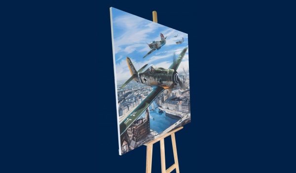 April 1945. Captain Hans Dortenmann flies over Berlin's ruins. he is opponing vainly his Focke Wulf 190D against a pack of Yak 3 fighters. Print on canvas mounted on a wooden frame like a real painting. This canvas print his varnished. It is numbered and signed on the back. Size : 90 x 90 cm. Limited edition of 10 copies