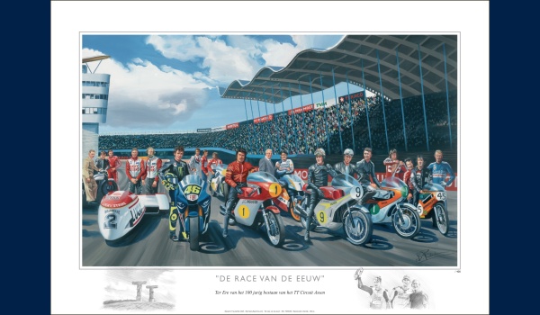 The painting on this print has made on commission to celebrate the 100th anniversary of the famous "Duch TT". this is the nickname of the Assen motorcycle grand Prix. Together with the French "Bol d'Or" and the "Tourist Trophy", it is one of the 3 famest motorcycle races in the world. The picture show a fantasy start line depicting the most illustrious Dutch TT winners (Giacomo Agostini, Mike Hailwood, Valentino Rossi, Barry Sheene, Egbert Streuer & Bernard Schnieders.. etc). By the way, the tittle of this painting is "the race of the century" ("de race van de eeuw" in dutch) - It is edited in a range of 400 signed and numbered copies printed on 250 g art paper. 350 prints are already sold to the Dutch Grand Prix. Only 50 copies are available on my website.