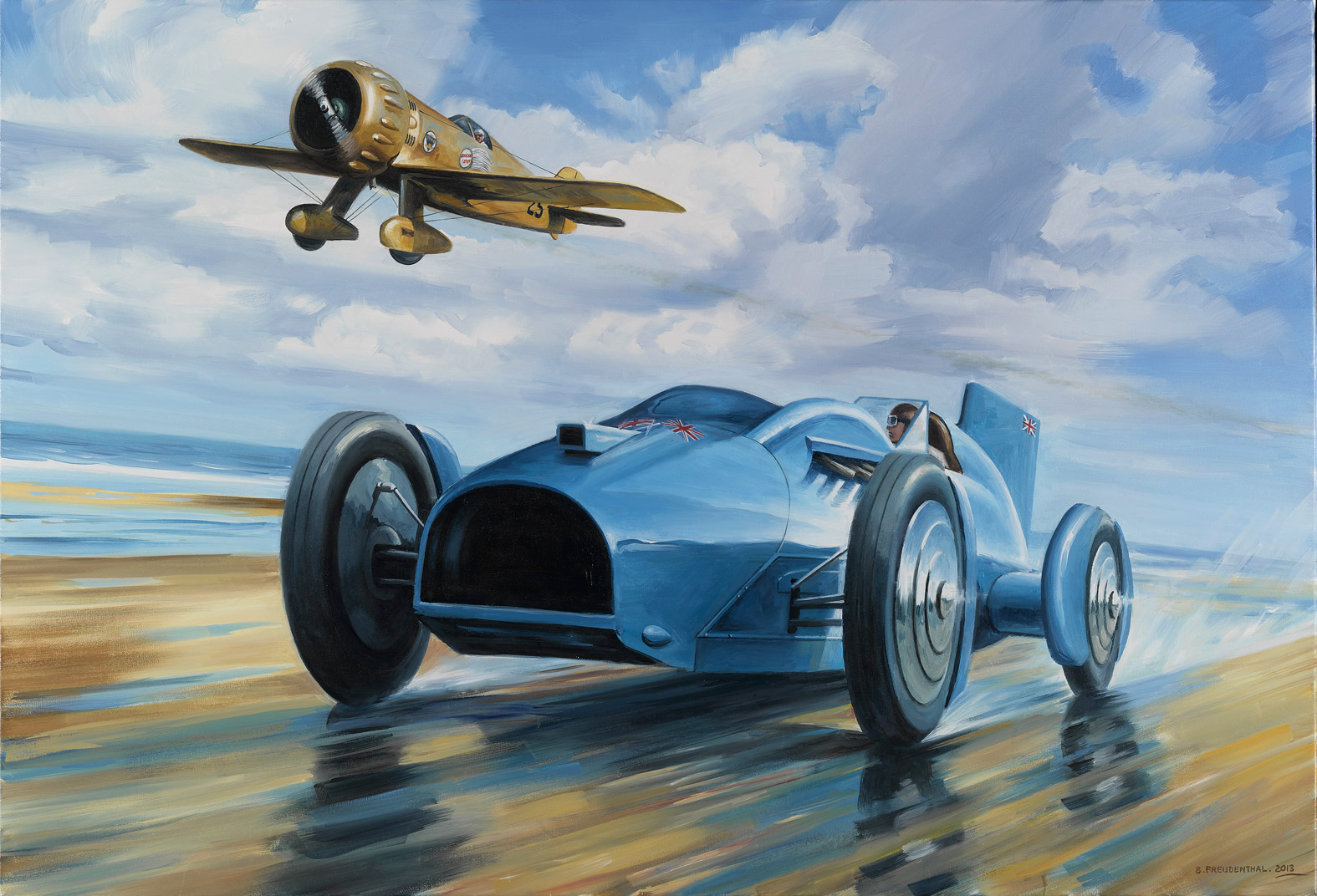 Une peinture qui rend hommage à deux champions de la vitesse sur terre et dans les airs. Malcolm Campbell régnait qur les record de vitesse terrestres tandis Roscoe Turner dominait les courses aériennes dans les années 30. Cette composition est imaginaire. Ils ne se sont sont jamais rencontrés en réalité.