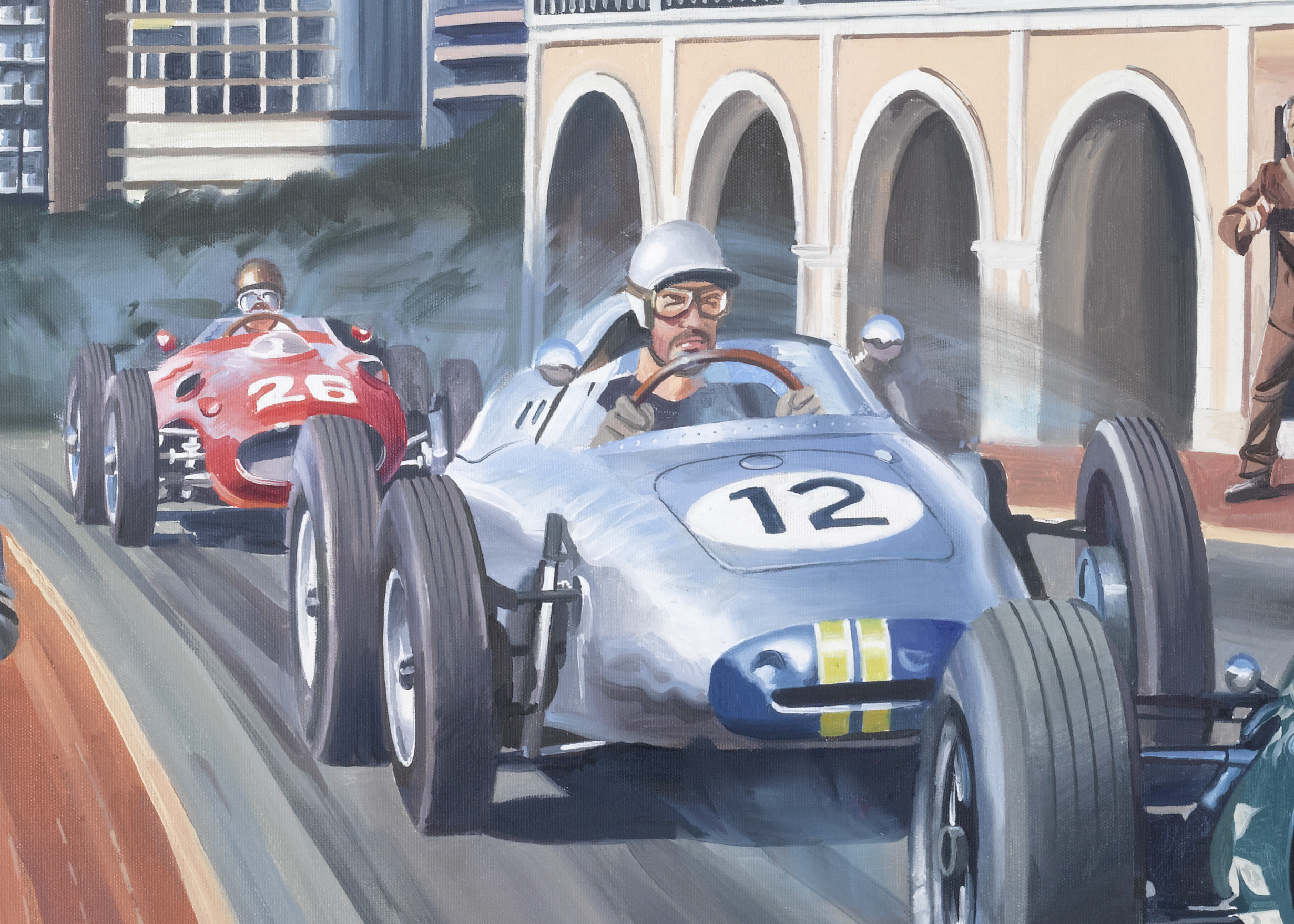 Cette peinnture mélange la réalité historique et les nécessaires contraintes d'une commande.Les voitures sont conformes à celle qui ont participé à la course de 1959 (Cooper T51, Ferrari Dino 246, Porsche F2), mais le pilote en tête n'est personne d'autre que le client lui même. Dans  public présent sur le trottoir (c'est strictement interdit dans la réalité), se trouvent l'épouse et leur petit garçon en train de le regarder passer dans sa magnifique Cooper T51. Pour permettre cette mise en scène, j'ai du peindre la montée du Beau rivage plus étroite qu'elle n'est. Et puis il y a tous ces personnages célèbres qui font partie du public. L'atiste est lui même caché dans le tableau. Amusez-vous à le retrouver !