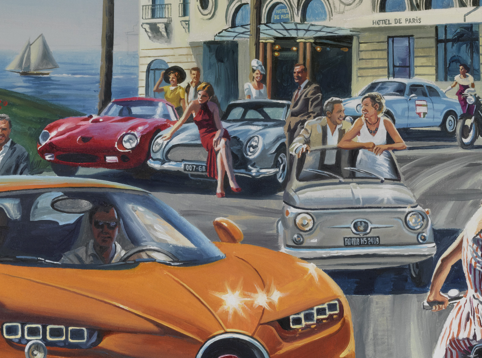 Cette peinture a été réalisée pour le salon Essen Techno Classica 2020. Les organisateurs m'ont demandé de mêler différentes époques dans un même tableau. Les années folles sont représentées par une Bugatti Royale. Elle cotoie une Bugatti Chiron des années 2000. Une Fiat 500 et l'Aston Martin de l'agent 007 évoquent les années 50. Une jeune fille sur un scooter Vespa symbolise la liberté de la fin des années 60. Au volant de la Bugatti Royale, l'auteur du tableau a l'air très heureux ! Il vient de conduire le couple « Leonardo di Caprio / Kate Beckinsale » à l'hôtel de Paris que l'on voit en arrière plan...
