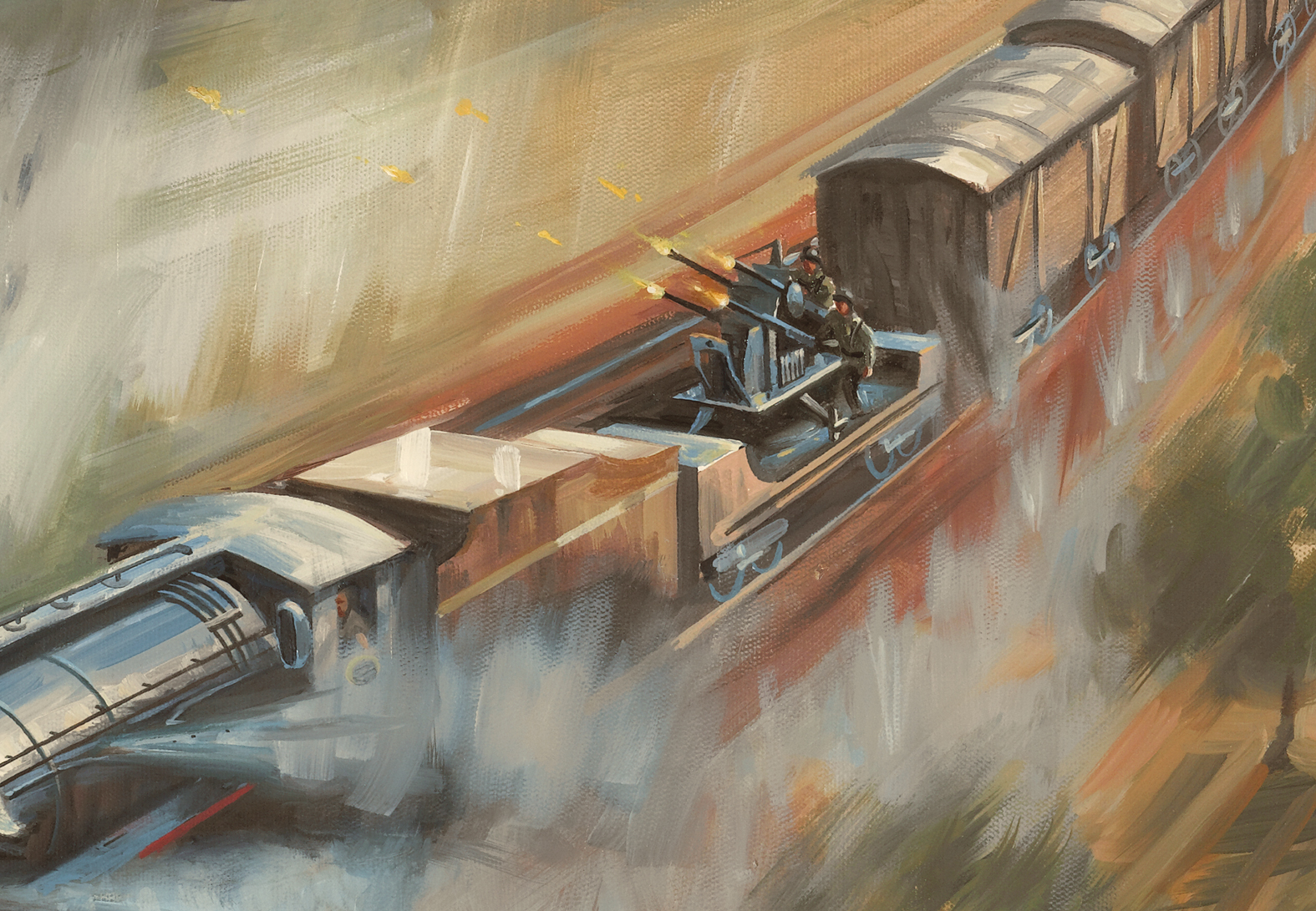 Une scène spectaculaire montrant le Spitfire de Jacques Andrieux lors d'une attaque de train en 1944. L'avion, un Spit MKV, au moteur gonflé et aux ailes rognées était spécialement prévu pour les attaques à basse altitude. Ce genre de mission était redouté car les convois de train été puissamment défendus pas des canons de 20 mm sur affut quadruple (voir détail 2).