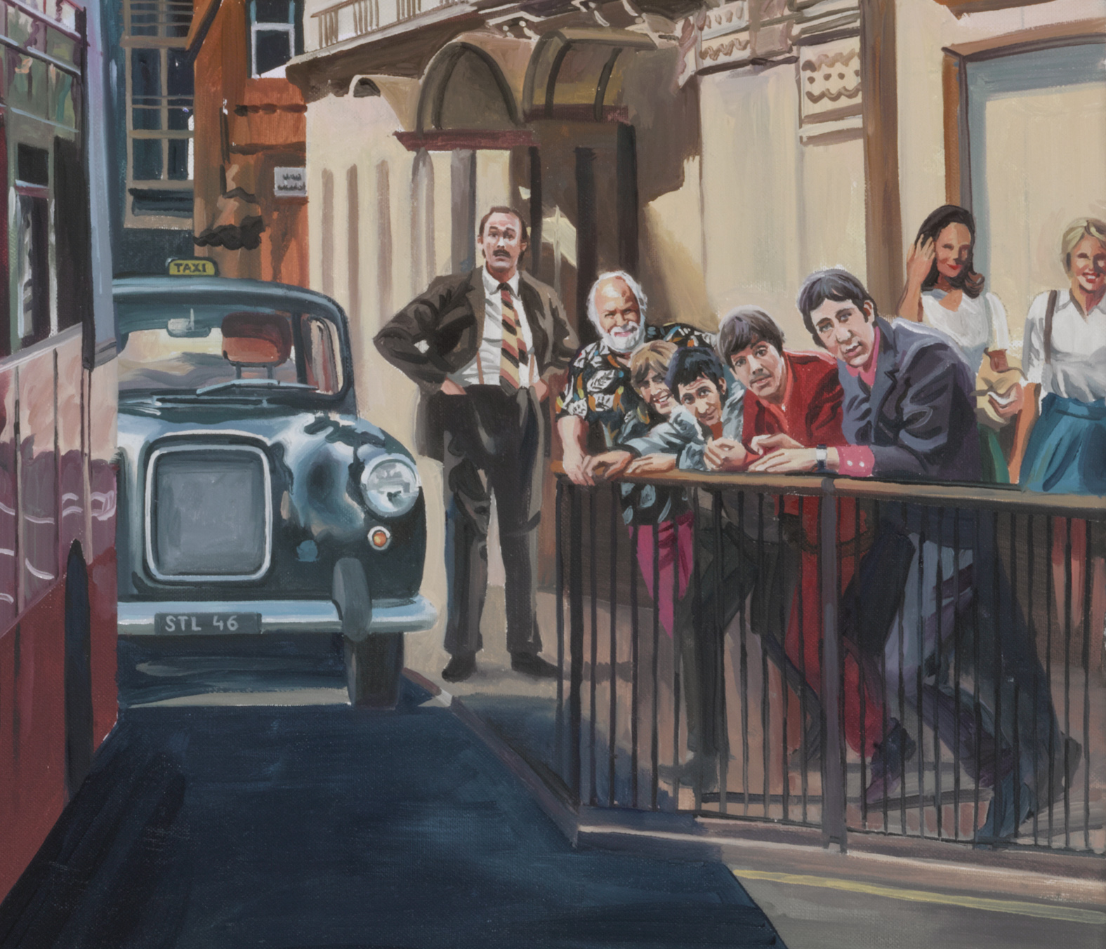 Trois groupes de Pop/rock assistent à la bagarre : à gauche les « Rolling Stones » regardent la bagarre d'un sourire amusé. Les « Beatles », dans l'autobus Imperial ont l'air franchement effrayés. A droite, les « Who » récupère de leur dernier concert, vautrés sur la barrière piétonne. A côté du taxi, John Cleese (« Fawlty towers ») regarde la scène, complètement ahuri. Piccadilly clash est avant tout un hommage aux « Swinging london des années 60. Peinture disponible -  Prix sur demande