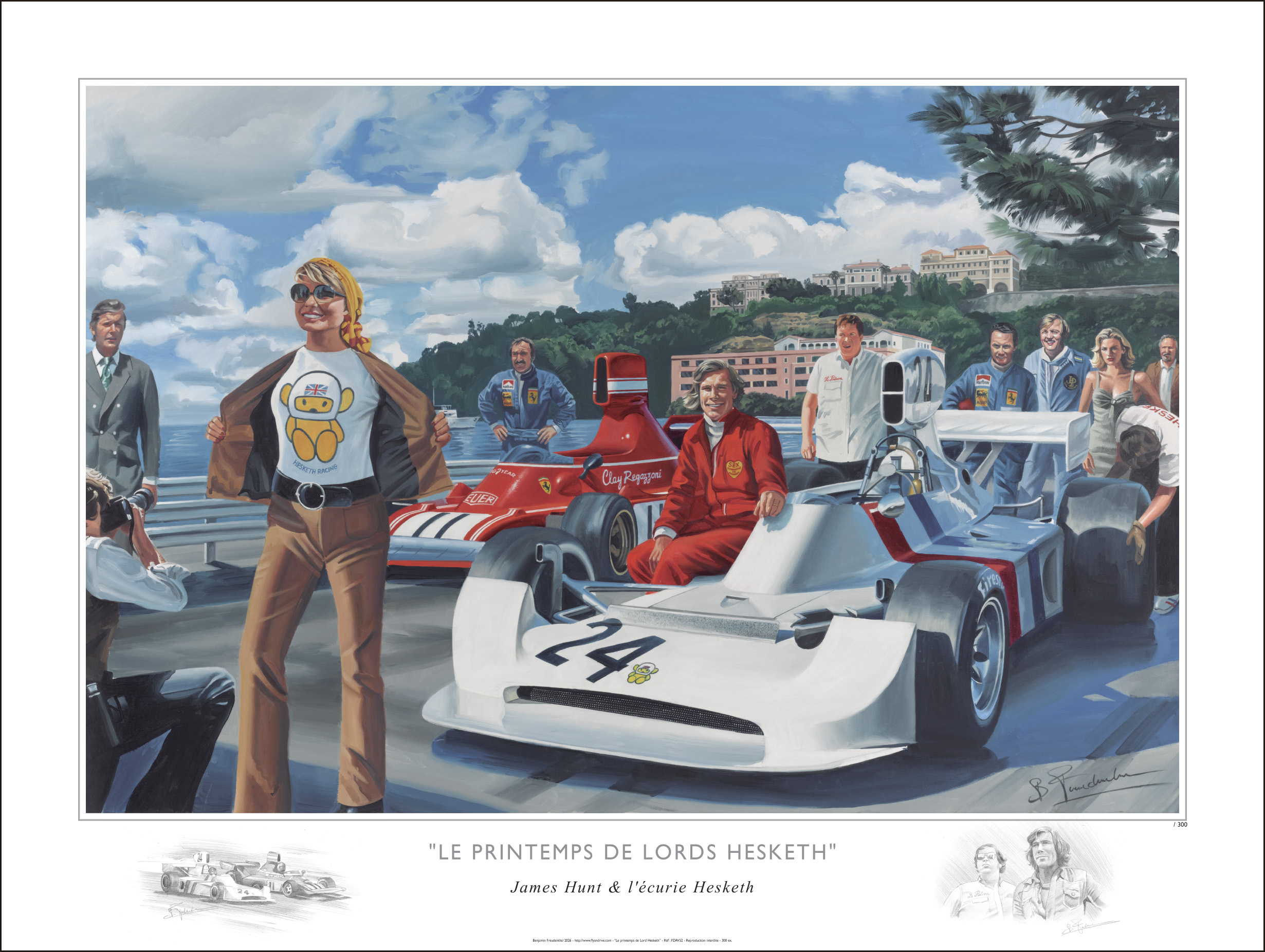 Lord Hesketh et James Hunt, c'est avant tout une grande histoire d'amitié entre un jeune pilote extraordinairement doué et un lord iconoclaste passionné par le sport automobile. Ce dernier est assez fortuné pour se passer de sponsors sur ses voitures mais aussi pour organiser des fêtes somptueuses en dehors des circuits.Et James Hunt, le playboy n'est pas en reste ! Nous sommes en mai 1974 à Monaco. Vous voyez au premier plan, la compagne de Hunt, Suzie Miller qui arbore le t-shirt à l'effigie de l'écurie "Hesketh racing". De prestigieux rivaux entourent la hesketh 308B : Clay Regazzoni et sa Ferrari 312T, Nicky Lauda et Ronnie Peterson, vainqueur du Grand Prix de Monaco cette année là. Reproduction au format 80 x 60 cm imprimée sur papier d'art - 300 exemplaire signés et numérotés.