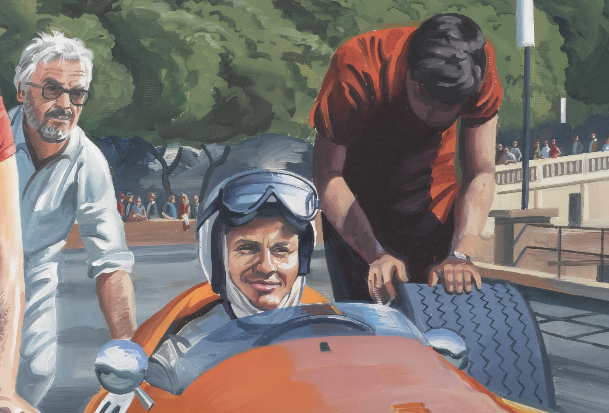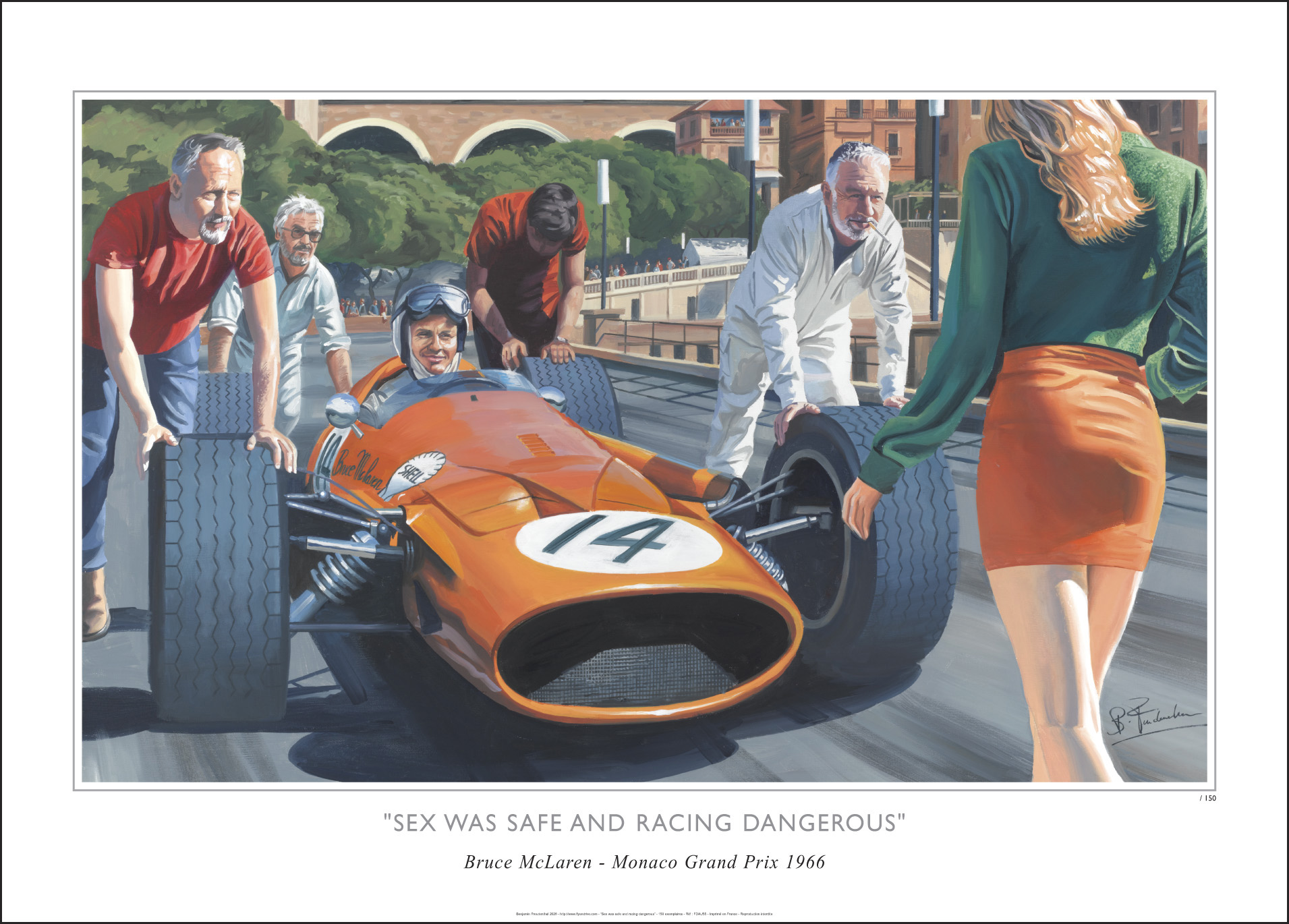 Le titre du tableau fait référence à une phrase célèbre prêtée à Jackie Stewart ou Jack Brabham. Le tableau illustre ce propos avec une palette de couleurs propre aux années 60. J'ai ainsi choisi la première formule 1 de Bruce McLaren dans sa belle livrée orange à laquelle répond la couleur de la minijupe. Le contexte est le Grand Prix de Monaco de 1966. C'est l'année où le moins grand nombre de voitures ont fini la course : seulement 5 pilotes classés ! Pour l'anecdote, (comme souvent) Je suis me moi-même représenté en train de pousser la voiture avec deux de mes amis déguisés en meccano. Reproduction format 70 x 50 cm. 150 exemplaires signés et numérotés.